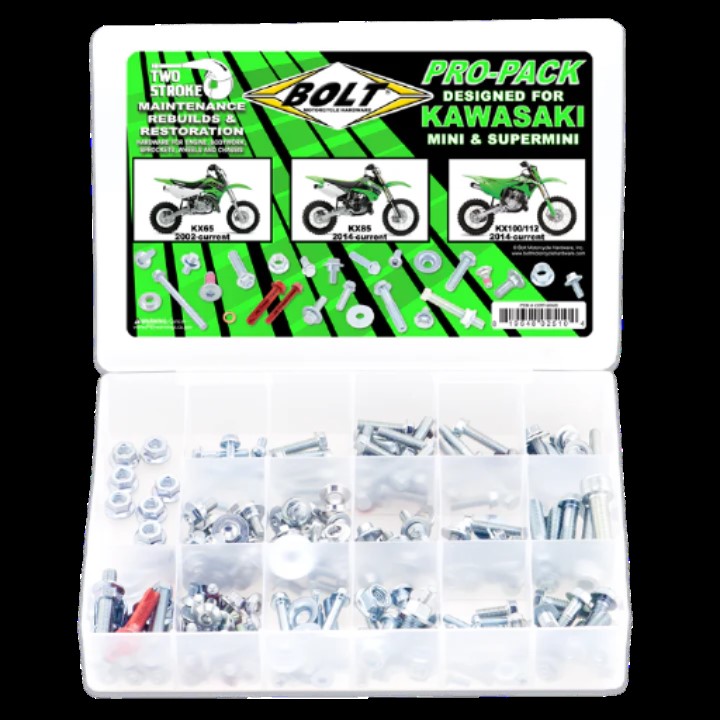 Este Pro-Pack para motos de dos tiempos está diseñado para el mantenimiento, la reconstrucción y la restauración de KX 65/85/100/112. Incluye tornillería de motor, tornillos de carrocería, un juego completo de tornillos de piñón, tornillos de rotor y tensores de cadena. Fijaciones OEM para tubo y silenciador, abrazadera de horquilla y eje, freno trasero, patines de cadena, subchasis, radiadores, manillar y controles. Incluye guías de rosca.