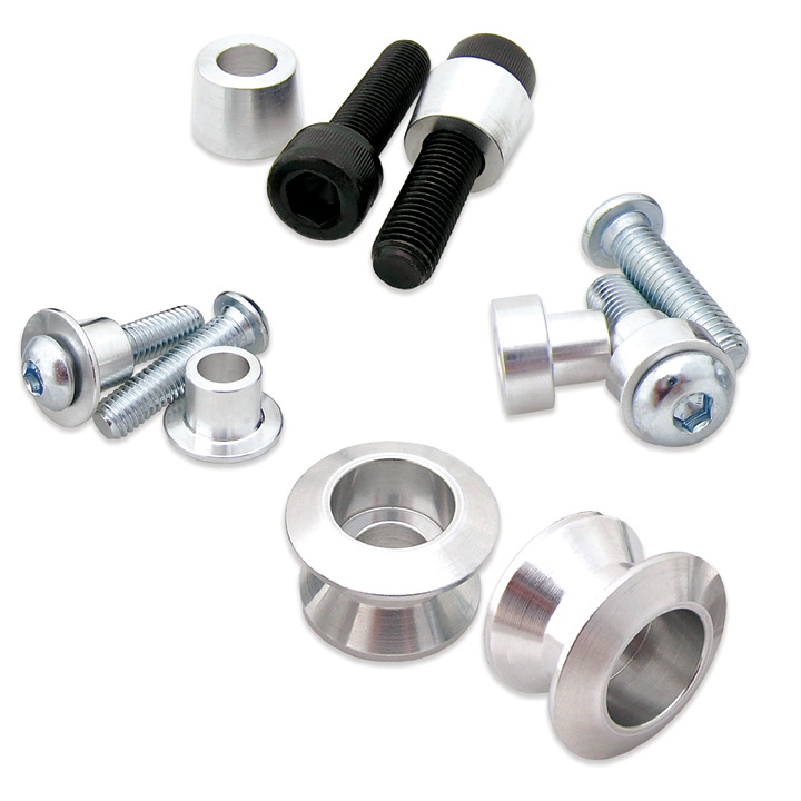 Este kit universal está garantizado para todas las motos deportivas Honda, Yamaha, Suzuki, Kawasaki, Ducati, BMW, Aprilia y Triumph con soportes de carrete de basculante de fábrica. Los carretes de aluminio billet 6061 de perfil bajo se mantienen alejados de la pista en todos los ángulos de inclinación. La base cónica guía las horquillas de elevación hacia el exterior del carrete para que no rayen el basculante. Incluye toda la tornillería de montaje para orificios M6, M8 y M10 e instrucciones de instalación.