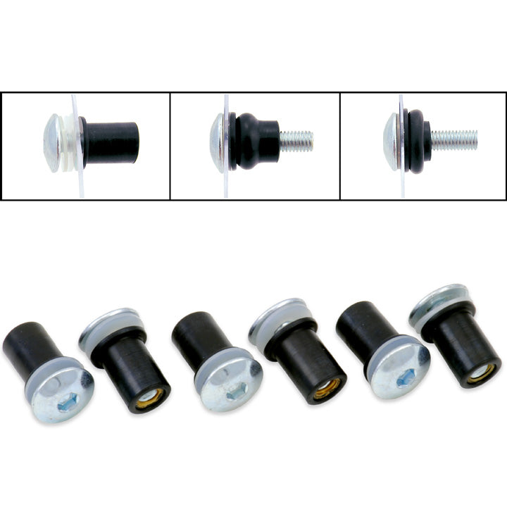 Diseñado para minimizar los impactos y sujetar firmemente el parabrisas. Cada kit incluye seis tornillos Allen M5 de perfil bajo y nuestras tuercas de compresión especialmente diseñadas. También incluye arandelas de nailon para proteger la carrocería de rayones durante la instalación.