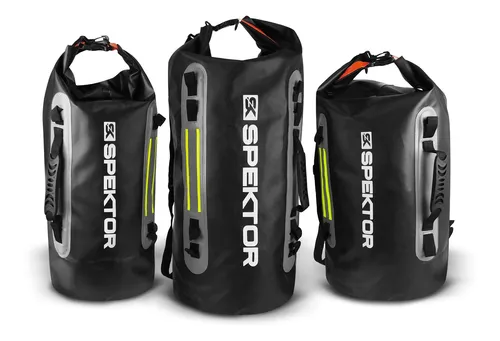 Marca: Spektor – Bolso Estanco, capacidad 30 Litros. Incluye 1 correa de cortesía para llevar estilo bolso cruzado. Hebillas de apertura rápida. Asa de silicona soft. Anillas en forma de D, para sujetar mediante sus correas extra. Banda refractaria en el frente. Cierre hermético enrollable. Protección UV. Diámetro 25 cm, alto útil 60 cm.